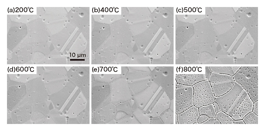 その結果、図8に示すように、一連の200℃から800℃までの加熱その場観察において、顕著な粒界近傍での酸化物の形成は観測されなかった。それほど長時間保持の検証を行ったわけではないが、図6で示した酸化物の形成は試料からの持ち込み酸素の可能性が高いことを示している。なお、600℃での組織を比較すると粒界部で生じる窪みの発生もやや遅れている傾向が観測される。800℃では、粒界での炭化物生成に起因すると考えられる粒界部分での不均一な凹部の形成が観測された。なお、さらに温度を上げるとこの粒界の黒いコントラストは消失して、粒界の凹部の形成は改善されていく。