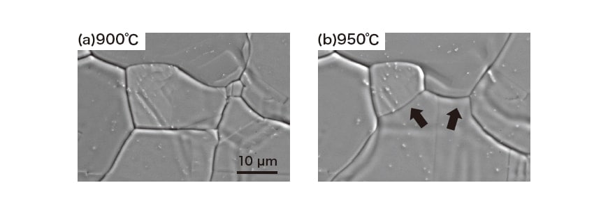 酸化物も含め、粒界部分での不連続な黒いコントラストも消えた様子を図9(a)に示す。鋭敏化処理で生成した炭化物が高温での固溶化処理により再びオーステナイト中に固溶していくことはよく知られているので、これは粒界内部に形成された不均一なM23C6析出粒子による表面凹凸の形成と、その粒内への再固溶に基づく不均一性の消失に対応していると考えている。SUS304系オーステナイトステンレス鋼の均一化処理は1,000℃以上でよく行われるが、SEM内のその場観察でも図9(b)に示すように、950℃では顕著なオーステナイト粒界の移動が始まっている。すなわち、産業上必要な高温処理における材料組織変化の特徴は、SEM内でのその場観察でも十分に追跡できると考えられる。また、SEM内ミニラボ化という視点では、加熱だけでなく変形応力下での低温度域における鋭敏化現象なども昔からの課題であり10)、最近の技術で新たな検討を加えられることが出来れば興味深い。