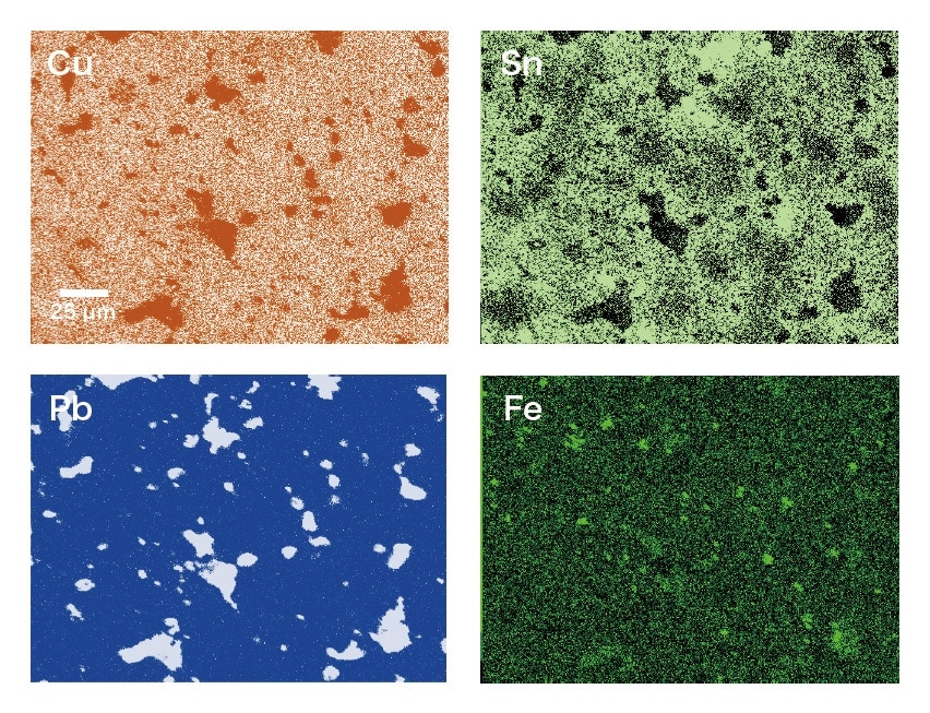図3は図2(b)領域の元素分布像である。Cu はマトリックスにほぼ均一に分布しており、暗い領域にはδ相およびPb 粒子がある。Sn の分布は不均一で偏析がみられ、図2(b)の腐食像と一致する。Fe の分布像では、数μm 程度のFe 濃度の高い領域が点在している。このCu 合金は上記のようにCu-Sn-Pb-Fe-C 系であるが、固溶度が高いのはCu-Sn 系(Sn の固溶度は約14 mass%)だけで、他の2元系は互いに固溶度が極めて低い6)。Pb はαCu の凝固温度よりかなり低いので、粗大なPb 粒子は低温まで保持されてから凝固したものである。粗大なPb 粒子からは約4.5 mass% のCu が検出され、後述のようにPb 中にCu 粒子が存在する。