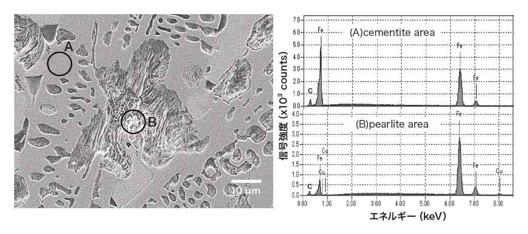 白鋳鉄領域の代表的な走査電子顕微鏡像とエネルギー分散X線分光像を図4に示す。走査電子顕微鏡像のA で示す地はセメンタイトである。また、B の暗い層状の組織はγFe が変態したパーライトであり、αFeと針状のセメンタイト(Fe3C)からなる。セメンタイト領域A のエネルギー分散X線分光像では、白鋳鉄の主成分であるFe およびC が検出される。これに対して、B で示したパーライト領域では、Fe およびC のほかにCu が検出された。Cu 濃度は分析したパーライト領域によってばらついているが平均で約4.5 mass% である。Fe-Cu 系状態図12)に示されるFe に対するCu の最大固溶度はγFe で約8.5 mass%(1094℃)、αFe で1.4-3.0 mass%(800-850℃)13,14)であるが、室温の固溶度は非常に低く、正確な固溶限は明らかでない。パーライト中にCu が存在するのは、変態する前の高温で晶出したγFe に固溶していたCu がパーライトのαFe に引き継がれたものである。γFe は面心立方晶でCu の結晶型と同じであり、γ相へのCu の固溶度は高いが、Cu は変態後のセメンタイトに固溶しないので、αFe 中に偏析する。鋳鋼および鋳鉄では、Cu の微量添加でαFe の強度が高くなると報告されているおり15)、これはCu 微粒子による析出硬化である。