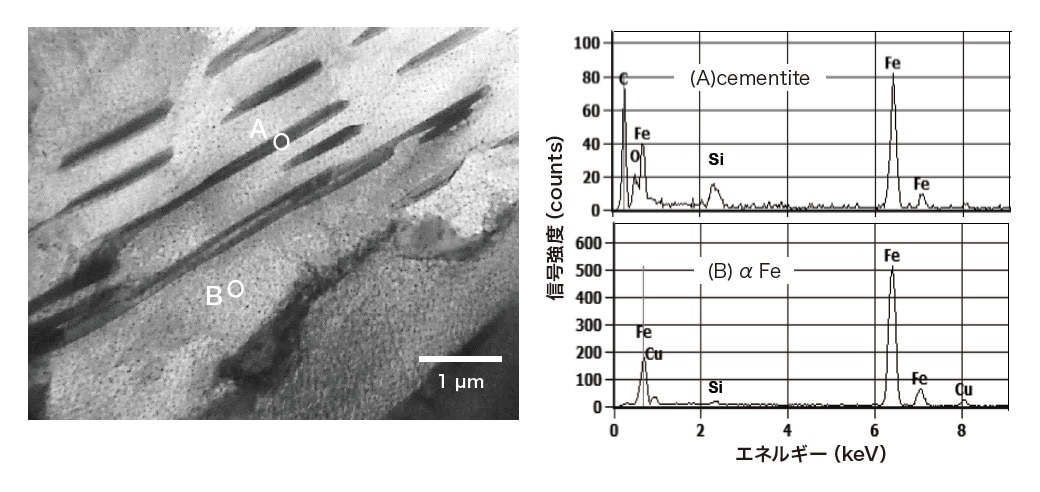 図5 ⽩鋳鉄のパーライト領域の透過電⼦顕微鏡像とエネルギー分散X線分光像