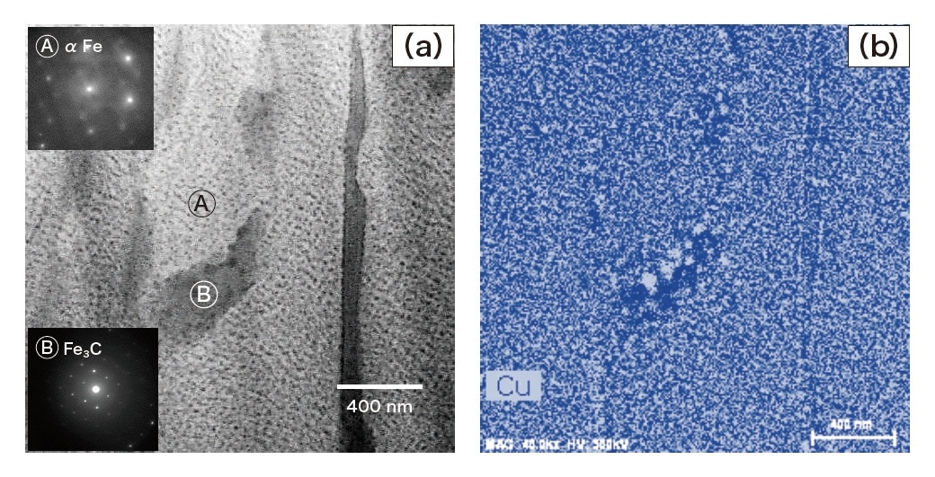 図6 パーライト領域の(a)透過電⼦顕微鏡像と電⼦回折像, および(b)Cu の分布像