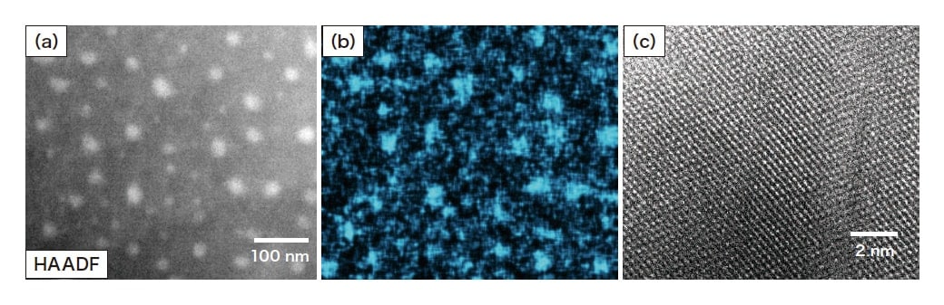 図11 αCu中の Pb 粒⼦の(a)⾼⾓度環状暗視野像(HAADF),( b)Pbの元素分布像および(c)Pb粒⼦の結晶格⼦像