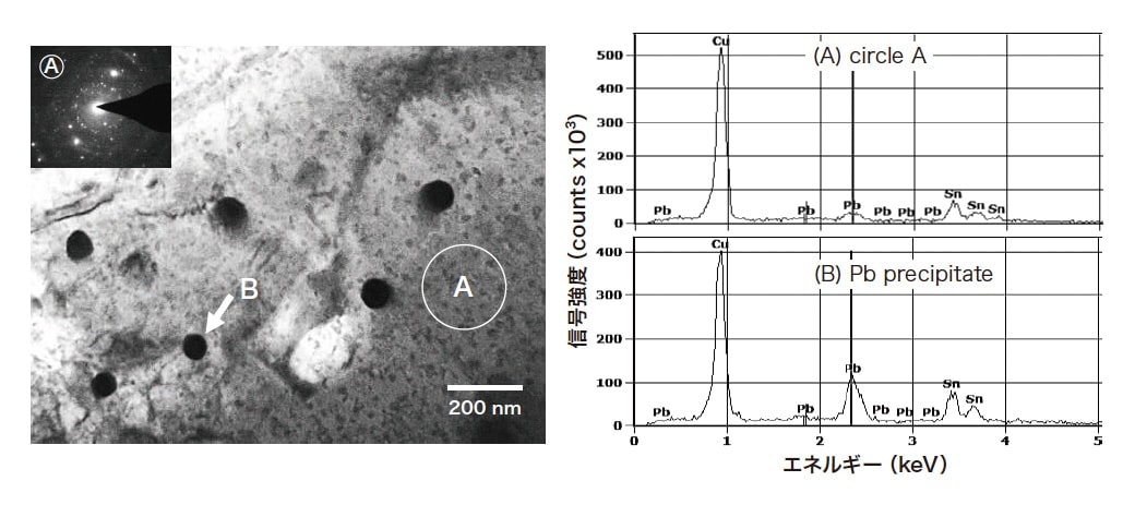 前述のように、CuとPb は非混合系であり、Pb の融点は古銭に含まれる金属の中で327.4℃で最も低く、通常であればPbはこの温度まで液体となっている。αCu から排出されたPb の多くは凝集して比較的大きくなるが、凝集せずにαCu 中に過飽和で分散して存在していたPb 原子が微結晶として析出したものと推定される。