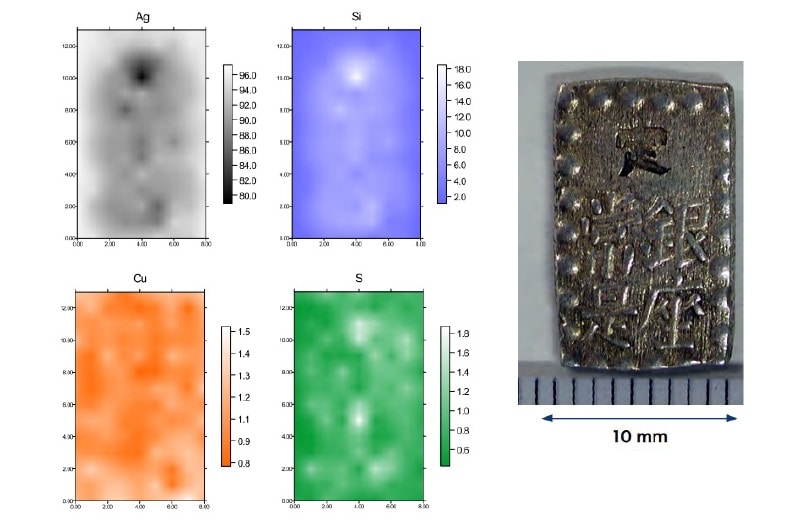 古銭の周囲の一部にはFe の錆があるので表面近傍にも白鋳鉄の一部が存在しているが、錆びる前は青銅貨のようにみえる。原料価格の低い鋳鉄貨を使用するのは北宋(Northern Song: 960-1127)時代あるいは西夏(XiXia: 1038-1227)時代に補助貨あるいは青銅の節約目的などに作られたのが始まりといわれている9)。本銭も価値の高い青銅の節約あるいは見かけの増量と考えられる。