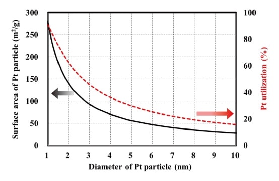図1 Pt触媒の直径とPt表面積およびPt利用率
