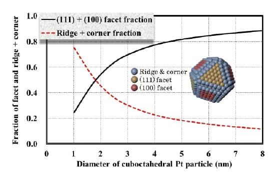 しかし、単純にPt 触媒の微粒子化によりORR 質量活性を高めることはできない。図2に、Ptナノ粒子の安定形態と考えられている立方八面体の直径とその(111)面と(100)面ファセットおよび稜とコーナーを形成する表面Pt 原子割合を示す32)。立方八面体の直径が減少するにしたがい、(111)面と(100)面のPt 原子割合が減少して稜とコーナーの原子割合が増加し、粒径が2 nm 以下になると稜とコーナーのPt 原子割合が急増する。稜とコーナーのPt 原子は(111)面や(100)面ファセットに比べて配位数が低く不安定であるため、ORR 過程で生じる酸素種と強く結合して安定化し、ORR に寄与しなくなる。Pt 触媒のORR 質量活性は前述したようにその表面積とORR 面積比活性の積である。Pt 触媒の微粒子化が進行すると表面積は増加するが、その直径が2 nm 以下になると触媒粒子表面で低配位数の稜とコーナーのPt 原子割合が急増してORR 面積比活性が大きく減少する。