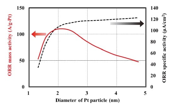 図3に、直径が異なるPt 触媒を合成してORR 面積比活性と質量活性を調べた例を示す33)。Pt 触媒の直径が2 nm 以下になると上述した理由によりORR 面積比活性が大きく低下していることがわかる。Pt 触媒のORR 質量活性は直径が2-3 nmで最大値を示しており、他の研究においてもPt 触媒が最大のORR 質量活性を示す直径は3 nm 前後である34, 35)。Pt 触媒の耐久性の観点からも、直径が2 nm 以下のPt 触媒粒子はPEFCカソードで生じる電位変動(0.6-1.0 V vs. RHE)により溶解再析出(オストワルド成長)を起こしやすく、触媒粒径が増加してORR 質量活性が低下する。したがって、Pt 系触媒のORR 質量活性と耐久性を考慮すると 触媒直径は3-4 nm が適していると考えられる。