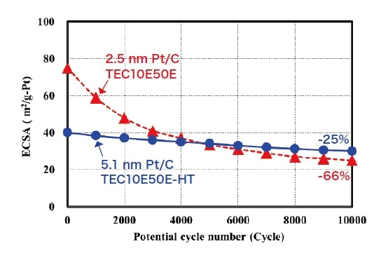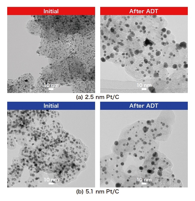 Pt 系触媒の耐久性に関し、その粒径による差異は極めて大きい。粒径が異なるPt/C 触媒についてADT 加速耐久性試験を行った際のECSA 変化を図9に、 ADT 加速耐久性試験前後のPt/C 触媒のTEM 像を図10に示す。粒径2.5 nm のPt/C 触媒はADT によりECSA が大きく減少し、10,000サイクル後にECSA は66% 減少した。一方、粒径5.1 nm のPt/C 触媒ではECSA はADT により徐々に低下し、10,000サイクルのADT によるECSA の減少率は25% であり、初期粒径が2.5 nm のPt/C 触媒に比べて耐久性が大きく向上した。TEM 観察から粒径2.5 nm のPt/C 触媒ではADT により粒径が8.5 nm に増加し、粒径5.1 nm のPt/C 触媒では7.0 nm の増加に抑えられており、図9に示したECSA の変化と対応している。