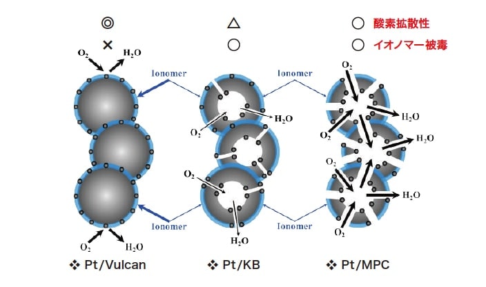 2020年12月に発売されたFCEV ではカソードにPtCo 合金触媒が用いられており43)、その担体としてメソポーラスカーボン(Mesoporous carbon: MPC)の一種であるエスカーボン®が採用された44)。MPC 担体の利点は高い酸素拡散性を維持しながらメソ孔内に約80% のPtCo 合金触媒粒子を担持させることにより、イオノマーが触媒表面に直接吸着することを防いでORR 活性の低下を抑えられることである。Pt 触媒表面にイオノマーに存在するスルホン酸基(-SO3-) が吸着することでORR 活性が低下することがわかっており45-47)、MPC はPt 系触媒の新しい担体材料として着目されている48)。図11に、PEFC の電池特性に与える炭素担体の多孔性の影響を概念的に示す。Vulcan は非多孔質の炭素担体であり、Pt 触媒粒子は担体の外表面に存在している。このため、水色で示したイオノマーが直接Pt 触媒表面に吸着してORR 活性が低下しやすい。酸素拡散性はPt 触媒粒子が外表面にのみ存在しているため、抵抗成分がなく高い。KB(Ketjen Black)は多孔性の炭素担体であり、一部のPt 触媒粒子が細孔内部に存在する。このためVulcan に比べてイオノマー吸着による被毒が軽減される。しかし、細孔内にPt 触媒粒子が存在するため、酸素拡散性はVulcan に比べて低下する。図12に、VulcanとKBに担持したPt系触媒の同一視野をSEMとTEMで観察した例を示す49)。非多孔質炭素担体であるVulcanに担持した場合、Pt 系触媒の数はSEM 像とTEM 像で大差なく、Pt 系触媒粒子のほとんどが炭素担体表面に担持されていることがわかる。Vulcan に対して多孔質炭素担体であるKB に担持した場合、SEM 像に比べてTEM 像で触媒粒子数が多く観察されており、一部の触媒粒子が担体に存在する細孔内に存在していることがわかる。VulcanとKBと比較し、MPC には連通性が高いメソ孔が存在しており、メソ孔内に担持されたPt 触媒粒子への酸素拡散は大きく低下しない。さらに、多くのPt 触媒粒子がメソ孔内に存在するため(≧ 80%)、イオノマー吸着による被毒が軽減されてORR 活性の低下も抑制される。