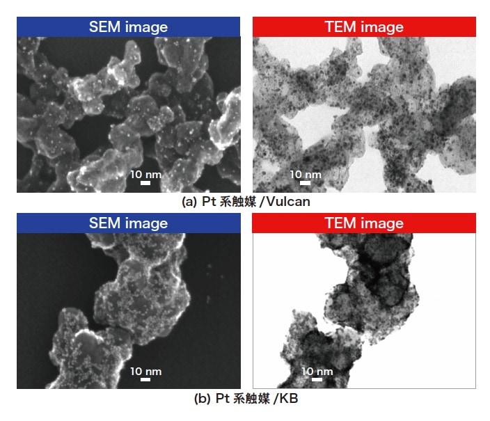 図12 VulcanとKBに担持したPt系触媒の同一視野SEM像とTEM像