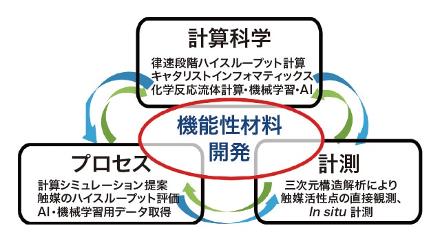 近年の材料開発の分野では、コンピューターや人工知能の進歩により、“ 経験と勘” に基づく従来の非効率な手法に代わる、良質なデータからインフォマティクスを用いて高速で材料開発を行うマテリアルズインフォマティクスが大きな潮流となってきている。このような背景の下、我々は、2016年から、計算・プロセス・計測の三位一体による機能性材料の高速開発を目指したNEDO 委託事業「超先端材料超高速開発基盤技術」を開始した。ここでは、有機系機能性材料をモデル材料として、①計算科学技術のマルチスケール化による材料物性予測技術の確立、②実サンプル試作の高速かつ自在な製造が可能な革新的プロセス技術の確立、③従来観測できなかった構造の精密観測や機能発現のその場観測等の先端計測技術の確立の三つの基本技術を融合して創出されるデータに基づいたデータ駆動型研究で、特定の材料物性の発現条件の予測技術確立を狙った(図1)1)。この技術融合型の開発により、従来の延長線上にない新しい材料探索技術の確立と研究開発期間の短縮を目指し、先端素材高速開発技術研究組合と横浜ゴム(株)およびUBE(株)との共同研究により、エタノール(EtOH)からのブタジエン(BD)合成触媒の開発およびフロー法によるPdコアPtシェル(Pd@Pt)触媒の合成法の開発を課題として進めた。ここでは、計算科学的アプローチに加え、触媒の自動合成、多連の反応器による迅速触媒性能評価、触媒物性の迅速測定等、触媒化学に重要な実験をハイスループット化し、大量のデータを迅速に取得することで、データ駆動型触媒インフォマティクスによる触媒の自動探索の取り組みについて述べる。