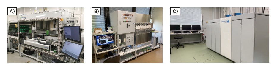 A) 触媒自動合成装置、B) 8連式触媒活性評価装置、C) 16連式触媒活性評価装置