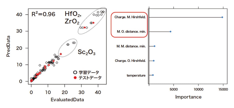 表2には、二段階目の反応結果の代表例を示す。ここでも、200種類の触媒評価を実施した。EtOH/AcH の比は50/50とし、活性は623 K で評価した。SiO2担持のHfO2, ZrO2, Sc2O3およびNb2O5触媒では、高いEtOH 転化率と高いBD 選択率を示した3)。HfO2やZrO2は優れたETB 触媒として知られていたが、新たにSc2O3もEtOH/AcH からのETB 反応に有効な触媒成分であることがわかった。活性の高かったHfO2, ZrO2, Sc2O3およびNb2O5触媒について各種条件の最適化を行った。その結果、HfO2担持量7 wt%、EtOH/AcHモル比が1.5、反応温度673 K において、最高収率63%を得た。以上のデータを基に、EtOH/AcH 原料での反応におけるBD 収率予測モデルを作成した。学習データを180、テストデータを20としてランダムフォレスト法により検討した(図3)。BD 収率には、金属酸化物の金属電子電荷が最も重要度が高く、次に、金属原子と酸素原子の距離もBD 収率に重要な記述子であることがわかった。これは、金属部分が(+)電荷を有しLewis 酸点として機能し、酸素部分が(-)電荷となりLewis 塩基として働くと考えれば反応機構的にも妥当な結果と考えられる。