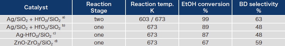 ここまでのハイスループット評価や、そこから得られた200程度のデータや理論計算データを用いた統計解析に基づき、一段階目ではAg/SiO2触媒、二段階目ではHfO2/SiO2触媒が有効であることが明らかになった。そこで、タンデム型のフローリアクターを設計し、これらの金属種の組み合わせでの二段階反応でETB の活性を評価した結果を表3に示した。一段反応では、Ag/SiO2とHfO2/SiO2の物理混合触媒、およびAg とHfO2をSiO2に同時担持した触媒は、BD 選択性が低い値であった(48%)。また、ZnOとZrO2をSiO2に担持した触媒では、EtOH 転化率が低い値であった(67%)。これに対して二段反応の場合には、反応温度をそれぞれの反応に最適な603と673 K にすると、EtOH 転化率99%、BD 選択率63% を達成した3)。さらに興味深いことに、Ag/SiO2+HfO2/SiO2 (物理混合触媒)、Ag-HfO2/SiO2 (同時担持触媒)およびZnO-ZrO2/SiO2 (同時担持触媒)による一段反応では、いずれも反応の経過とともに触媒活性が大幅に低下したが、Ag/SiO2とHfO2/SiO2による二段階反応プロセスでは、BD 収率はほぼ安定しており、反応時間の経過に伴う触媒活性の低下が抑えられることがわかった。触媒寿命の観点からも二段階反応プロセスが有効なものであることが明らかになった。現在、これらの触媒の改良を進めるとともに、種々のエンジニアリングデータをハイスループット装置により取得し、プロセスインフォマティクスを活用しながら実用化に向けたスケールアップ検討を実施している。