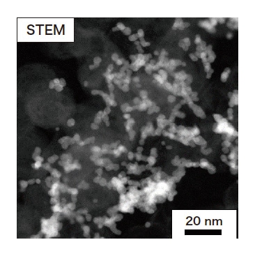最初に、Pt 前駆体をH2PtCl6として、還元剤の種類がPtシェル構造と触媒活性に与える影響を検討した。合成したPd@Pt 触媒のPt-Pt 配位数およびPt-Pd 配位数は、XAFSスペクトルを測定して、そのフィッティング解析から求めた。また、触媒活性は、酸化還元反応(ORR)活性を調べた。還元剤として2-MePy・BH3を用いた場合、Pt-Pt およびPt-Pd配位数は、それぞれ6.8と2.5と見積もられた。これは、単原子層のPtシェルが形成した場合の理論値(NPt-Pt : 6, NPt-Pd :3)に近いことから、ほぼ1層のPtシェル構造に制御されたPd@Pt 粒子が形成していることが考えられる。しかし、Pd@Pt 触媒中の白金有効利用面積(ECSA)、Pt 重量当たり(MA)およびPt 表面積当たり(SA)のORR 活性は、既存の銅-アンダーポテンシャル析出法(Cu-UPD 法)により調製したPd@Pt 触媒に比べて半分程度の値しか示していない。単原子層のPtシェル構造を有しているにもかかわらず、Pt 表面積およびORR 活性が低いのは、図5に示すように、Pd@Pt 粒子同士が凝集しているためであることがわかった。