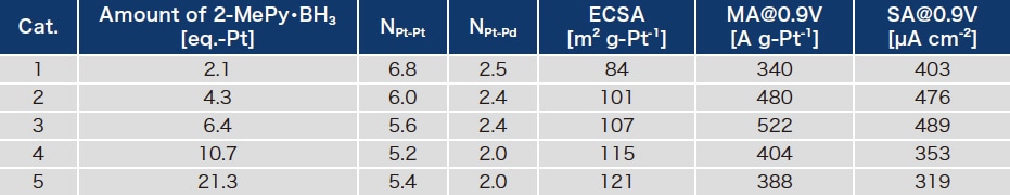 表 4 Pd@Pt 触媒の構造および触媒特性に及ぼす2-MePy・BH3添加量の影響