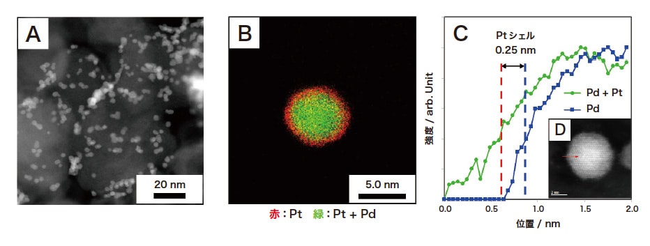図6 Pt前駆体をH2PtCl6、還元剤を2-MePy・BH3(6.4 eq.-Pt)から合成したPd@Pt触媒(Cat. 3)のTEM像(A)、EDSマッピング分析(B)およびEELSライン分析(C, D)