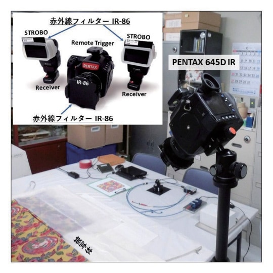 赤外線写真撮影は、図1に示したように、カメラPENTAX 645D IR(有効画素数約4000万画素)の本体にレンズsmcPENTAX-FA645 75mm F2.8を取り付け、光源にはストロボCanon SPEEDLITE 420EX を2灯使用し、カメラのレンズ前面とストロボ発光面の両者に赤外線フィルター IR-86(波長860 nm から長波長側の赤外線を透過する富士フイルムシャープカットフィルター)を取り付け、さらにカメラ本体にはワイヤレス リモート フラッシュ トリガ(NEEWER 製)を、そのレシーバーはストロボ(2灯)にそれぞれ取り付け、シャッターとストロボを同期させて発光させ撮影している。したがって、暗室で撮影する必要もなく、ストロボからは波長860 nm よりも長波長側の赤外線が試料面に照射され、カメラは被写体から反射してくる波長860 nm よりも長波長側の光(赤外線)を受光してデジタル画像となり記録される。なお、通常はカメラ本体の内部に装着されている紫外線や赤外線をカットし可視光線のみを透過するバンドパスフィルターは除いている。