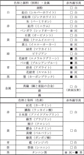 表1 色材(顔料・金属・染料)の赤外線写真