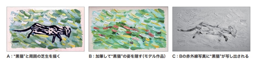 油彩画の下絵(下素描)が木炭(カーボン)で描かれていれば、その下絵が赤外線写真によって確認できることは良く知られている。しかし、この現象は木炭だけではない。赤外線を吸収するプルシアンブルーであっても確認することができる。これは、図2に示したように、ひろしま美術館が所蔵するゴッホ最晩年の代表作の一つ油彩画「ドービニーの庭」(縦530 mm×横1030 mm)を X 線分析顕微鏡 HORIBA XGT-5000による元素マッピング解析によって、画面左下の芝生に(芝生が描かれている絵具層の下に)ゴッホが描いたとされる “ 黒猫 ” の姿が存在するか否か確認するときのことであった2,3)。この部分は、現在も第三者の加筆によって、その “ 黒猫 ” の姿は隠されている。実物の文化財を使用して実験することはできない。事前に検討が必要であればモデル作品を制作して実験する。この元素マッピング解析によって絵具層の下に隠されている“ 黒猫 ” の姿が確認できるか否か実験するため、モデル作品を制作した。このモデル作品は、画家の吉田寛志氏による模写によって制作された。彼は、ゴッホが用いたと思われる油絵具を使用し、“ 黒猫 ” が描かれていると思われる箇所を模写しモデル作品を制作した。まず、図3のAに示したように、プルシアンブルーとクロムイエローを混色して、いわゆる別称 “クロムグリーン” を作り、さらにプルシアンブルーを加えて黒に近い濃い青色の絵具を用い “ 黒猫 ” の姿を描いた。そして、図3の B に示したように、ゴッホが使用したであろうジンクホワイトを主体にシルバーホワイトも用い、黄色のクロムイエロー、緑のビリジアンやエメラルドグリーンを使用し、“ 黒猫 ” の周囲と同様に、“ 黒猫 ” の上に加筆して、芝目の1つ1つを盛り上げて塗り重ね、最初に描いた “ 黒猫 ” の姿を隠した。そしてさらに、これらに加えて第三者が用いたであろうレッドオーカーも重ねて加筆しモデル作品を制作した4)。この赤外線写真が図3の C である。この模写に使われた絵具の内、赤外線を吸収し赤外線写真で黒化するのはプルシアンブルーとエメラルドグリーンであり、白化するのはジンクホワイト、シルバーホワイト、クロムイエロー、そしてビリジアン、また灰化するのはレッドオーカーである。赤外線を吸収するエメラルドグリーンは芝生に点在しているが、“ 黒猫 ” の姿はプルシアンブルーを主体に描かれている。そのため、芝生を加筆して絵具層の下に隠した “ 黒猫 ” の姿が赤外線写真に写し出されることになった。このように、下素描が木炭でなくても、赤外線を吸収する色材が用いられている下素描であれば、赤外線写真に写し出されることになる。なお、実物の作品では、残念ながら “ 黒猫 ” の姿を赤外線写真に写し出すことはできなかった。これは、想像以上に絵具層が厚かった為と思われる。しかし、図4に示したように現場(美術館仮設実験室)での X 線分析顕微鏡によるスキャニング蛍光 X 線測定によって元素マッピング解析した結果、クロム元素のマッピング画像に猫の頭部、首、前足、胴体、そして尾の構図が現れ、ゴッホはそこに “ 黒猫 ” を描いていたことが確認できた。
