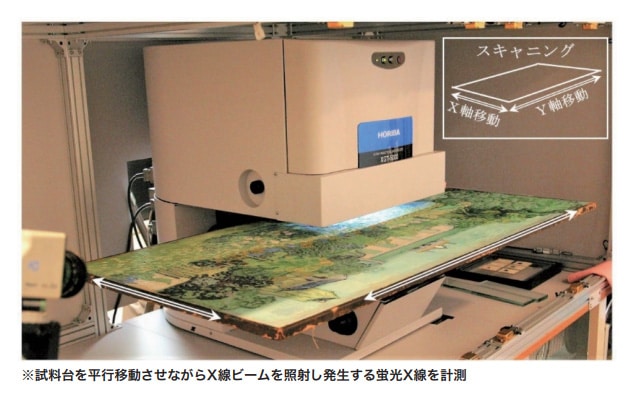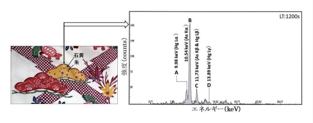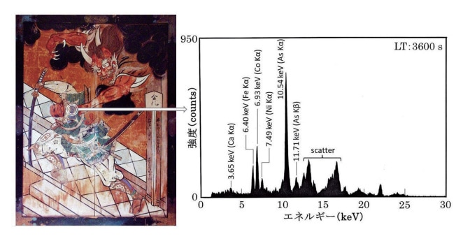 なお、XRFスペクトル測定による分析は、顔料や金属などの無機物の分析に適しているが、染料などの有機物は分析できない。これは、表2に示した「墨」の成分である炭素(C)から発生する蛍光 X 線のエネルギーが0.277 keVと極端に低く、現在のいかなる蛍光 X 線分析装置であっても検出できない。したがって、炭素(C)結合を主体に構成される染料などの有機物も分析できない。