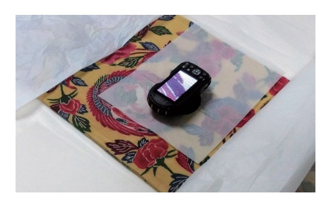 顕微鏡写真撮影には、マイクロスタンドリングを取り付けたカメラPENTAX WG-3(レンズ焦点距離4.5~18.0 mm、F値2.0W - F4.9 T、有効画素数約1600万画素)を使用している。紅型衣装の顕微鏡写真撮影では、図6に示したように、カメラレンズの径に合わせて円形の窓を切り抜いた保護紙を衣裳の上に被せ、その円形の窓の上にカメラレンズを合わせ重ねて置き(本体重量:電池・SDカードを含め247 g)、カメラのモニターに映し出される画像の中心に測定点と定めた箇所を配置して、デジタル顕微鏡撮影モードで光学倍率を設定し、リモート撮影している。なお、光学倍率は、×1.2倍、×2.5倍、そして最大×4.0倍と設定し、それぞれの倍率で撮影した画像データを PC で観察している。