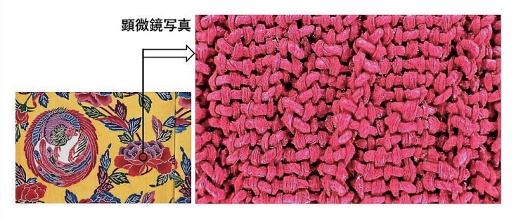 図7 紅型衣装に施された牡丹文様の赤い花弁の顕微鏡写真