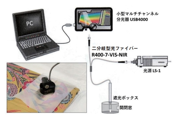 可視-近赤外線 Rfスペクトル測定装置の構成を図8に示した。Ocean Optics USA 製の二分岐型光ファイバー R400-7-VIS-NIR を用い、照射側の光ファイバーを同社製の光源 LS-1(タングステン・ハロゲンランプ)に取り付け、受光側の光ファイバーを同社製の小型マルチチャンネル分光器 USB4000に取り付けて使用している。例えば、紅型衣装の可視-近赤外 Rfスペクトル測定では、円形の窓を切り抜いた保護紙を紅型衣装の上に置き、窓の中心に測定点と定める箇所が配置されるように被せ、その上に光ファイバーの先端を挿入した遮光ボックス(390 g)を置く。次に、遮光ボックスの開閉窓から中を覗き込み、中にある光ファイバーの先端から測定点と定めた位置に光が照射されるよう微調整し、試料面との間隔を約3 mm 空けて、可視光線の領域から近赤外線領域の光(380 ~ 1000 nm)をピンポイント(1 mm φ)で照射する。そして、測定点から反射してくる光は、他方の光ファイバーから分光器に取り込み、波長毎に分光して可視光線領域から近赤外線領域の分光反射率曲線、すなわち可視-近赤外 Rfスペクトルを PC のディスプレーに表示させる。なお、この装置は、遮光ボックスを使用しなくても、光ファイバーの先端を測定点と定めた箇所に約3 mm 程近づければ、即座に反射してくる光が取り込まれ PC のディスプレーに映し出され、非破壊で可視-近赤外 Rfスペクトルが計測できるので、後述する《浮世絵版画に使用された「青」の色材》において記載したように、数多くの浮世絵版画を短時間に調査することができた。