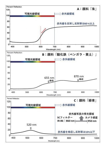 赤外線写真では、高い赤外線透過率をもつ顔料が使用されている部分に、下図(下素描)などの、表層下の様子がより検出され易い 1)。それぞれの色材が示す可視-近赤外 Rfスペクトルの「反射率」は「透過率」と読み替えることができる*4。このことから、可視-近赤外 Rfスペクトルの近赤外線領域における反射率から前記した赤外線写真による色材の白化度、あるいは黒化度が判る。例えば、その色材の赤外線領域における「反射率」が60 % 以上であれば、その色材の「透過率」は60% 以上と高く「照射した赤外線の多くが色材を透過する」と考えることができ、照射した赤外線の多くが色材を透過して、その下にある繊維などの表面で反射し、再び上層の色材を透過して外へ抜け出てカメラに取り込まれ受光され赤外線写真では白化し白く写し出される。逆に、その色材の赤外線領域における「反射率」が20 % 以下であれば、その色材の「透過率」は20% 以下と低く「照射した赤外線のほとんどが色材に吸収され透過しない」と考えることができ、照射した赤外線のほとんどは、その色材に吸収され、その下にある繊維などの表面に届くことも無く、また再び上層の色材を透過して外へ抜け出てくる赤外線も無いので赤外線写真では黒化して黒く写し出される。また、近赤外線領域の反射率が40 % 前後の色材では、照射した赤外線は多少吸収され一部は透過して、その下にある繊維などの表面で反射し、再び上層の色材を透過し外へ抜け出てカメラに取り込まれ受光されるが、色材から抜け出てくる赤外線の光量は少ないことから灰色に写し出される。具体的には、図9に示した A の「朱」、そして図11に示した B の「臙脂」や C の「藍」では、近赤外線領域における反射率が60 % 以上であることから、これらの色材は赤外線写真で白化し白く写る。逆に、図9に示した C の「緑青」、図10に示した A の「ベロ藍」とB の「群青」、そして図11に示した A の「墨」では、近赤外線領域の反射率が20 % 以下であることから、これらの色材は赤外線写真で黒化して黒く写る。また、図9に示した B の酸化鉄系顔料(ベンガラ・黄土)、そして図10に示した C の顔料「スマルト」では、いずれも近赤外線領域の反射率が40 % 前後であることから、これらの色材は赤外線写真で灰化し灰色に写る。この関係から、赤外線写真と可視-近赤外 Rfスペクトルを対比することで分析結果の正しさを確認することができる。