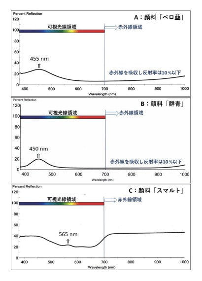 図10 ベロ藍(A)、群青(B)、スマルト(C)から得られる可視-近赤外Rfスペクトル