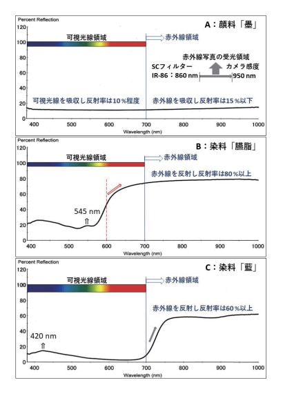 赤外線は、眼に見える可視光線よりも長い波長を持ち、可視光線のように物体表面で反射せず、物体の内部まで入り込んでいく。例えば、紅型衣装に使われている色材が赤外線を吸収せず透過すれば、その下にある絹、綿、または麻などの繊維表面まで到達して反射し、再び色材を通り抜けて外に出てくる。したがって、赤外線を透過する色材に赤外線を照射して撮影すると、繊維表面で反射した赤外線が再び色材から外へ抜け出てカメラに取り込まれ記録され白く写し出される。しかし、逆に赤外線を吸収する色材では、照射した赤外線が色材に吸収されてしまい繊維表面まで到達して反射することがなく、赤外線写真では黒く写し出される。そして、ある程度赤外線を吸収する色材では、色材を透過した赤外線だけが繊維表面に到達するので反射する赤外線も弱くなり、赤外線写真は灰色になる。また、赤外線を吸収せず透過する色材の下に目視では観察できない文字や描線(下素描)が墨(木炭)で描かれていれば、その文字や下素描が赤外線写真に黒く写し出される。紅型衣装などでは、赤外線を透過する色材に手描きで加えられた極細の墨線が赤外線写真では黒い描線となって写し出される。これらの現象は、炭素を主成分とする墨が赤外線を良く吸収することによる。赤外線写真で白く、あるいは黒く、もしくは灰色に写し出される色材(顔料・金属・染料)を表1に示した。
