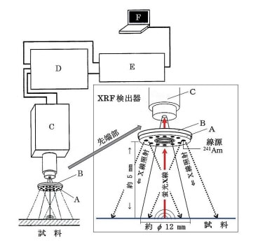 XRFスペクトル測定で使用しているオンサイト(現場)分析に対応した装置の構成を図15に示した。本装置では、X 線発生器として X 線管(管球)を使用していない。X 線を放出する放射線同位元素(Radioactive Isotope:RI)を線源として使用している。具体的には、X 線の発生源(線源)として AET Technology 製の放射性同位元素アメリシウム241(セラミックスで密封した粒状の241Am をリング状に配置して内包させた密封環状線源 1.85 MBq)A を使用し、この線源を測定点と定めた箇所に約5 mm の距離まで近づけ、241Am が放出する X 線(エネルギー:13.95 keV・17.74 keV・59.54 keV)を試料に照射する。241Am から放出される X 線は円周状に照射され、中心点から半径約6 mm の円形部分(12 mm φ)に存在する種々の元素から発生する蛍光 X 線を測定することになる。ここで発生した蛍光 X 線のエネルギーは、Amptek 製の検出器(半導体検出器 Si-PIN XR-100CR / Beウィンドウ 0.3 mil=7.62 µm /分解能 180-205 eV)C で計測され、さらに同社製のプリアンプ(PX2T/CR 型)D で増幅、次いで同社製の小型マルチチャンネル波高分析器(PMCA-8000A)E で分別して、パーソナルコンピュータF にインストールされた解析ソフトで XRFスペクトルとする。本装置は、エネルギー分散型の装置であるため多元素同時分析ができる。なお、図15の B は、線源 A の上面と周囲、そして内腔部を包み込んだ遮蔽材(鉛)であり、線源 A から放出される X 線が検出器 C の窓から取り込まれないようにしてある。また、この遮蔽材Bを挟んで線源A の上面と検出器 C の先端は密着させている。