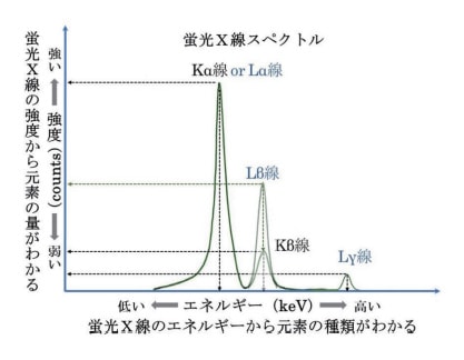なお、XRFスペクトルでは、Kα線よりもKβ線のエネルギーが高く(スペクトルの横軸の位置では Kα線の右側に Kβ線のスペクトルが現れ)、Lα線よりもLβ線のエネルギーが高く(Lα線の右側に Lβ線のスペクトルが現れ)、また Lβ線よりもLγ線のエネルギーが高い(Lβ線の右側に Lγ線のスペクトルが現れる)。このことも踏まえて、XRFスペクトルに現れたスペクトルが「どの元素に帰属する Kα線と Kβ線か、あるいは Lα線と Lβ線か?」読み解いていくことになる。