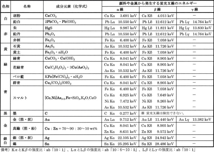 元素に固有であり、X 線分析の専門書には原子番号順に各元素から発生する固有の Kα線と Kβ線、あるいは Lα線と Lβ線と Lγ線のエネルギーがそれぞれ詳しく示されている11)。これを使用して、測定された XRFスペクトルの横軸のスケールから読み取ったエネルギーの値と同じエネルギーを蛍光X線として発生する元素が測定した試料を構成している元素となる。ここでは、表2に代表的な「顔料・金属の成分元素から発生する各種蛍光 X 線のエネルギー」を示した。測定された蛍光 X線のエネルギー(XRFスペクトルの横軸の位置から読み取ったエネルギー)と同じエネルギーを示す元素を検索すれば、それを成分元素とする顔料や金属が特定できる。