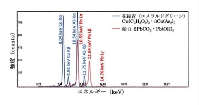 本装置は分解能が180 ~ 205 eV の半導体検出器を用いたエネルギー分散型の蛍光 X 線分析装置であり、多元素から発生した蛍光 X 線のエネルギーを同時に検出するが、異なる元素から発生したエネルギーが近接していて205 eV =0.205 keV 以上の差がないと重なることになる。例えば、緑色顔料の「花緑青」は、前記したように銅(Cu)とヒ素(As)を主成分元素とし、両元素から同時に発生した蛍光 X 線が XRFスペクトルに現れる。この「花緑青」だけが使用されていれば、図19aに示したように、Cuと As のそれぞれから発生した Kα線と Kβ線のエネルギーはいずれも近接しないので重なることなくそれぞれのスペクトルが確認できる。しかし、彩色表現では明度を高く明るい色調とするために白色顔料の「鉛白」を加えることがある。濃い緑の「花緑青」に白い「鉛白」が加えられて明るい緑色とされた場合、図19c に示したように、「花緑青」から発生した蛍光 X 線のエネルギー(図19a)と「鉛白」から発生した蛍光 X 線のエネルギー(図19b)が同時に検出され、「花緑青」に由来して発生した As の Kα線と「鉛白」に由来して発生した Pb の Lα線は重なることになる。このことは、「花緑青」と「鉛白」が混在している場合に限らず、測定試料に Asと Pb の両元素が共存すれば、As の Kα線(10.532 keV)と Pb のLα線(10.550 keV)は重なることを示している。
