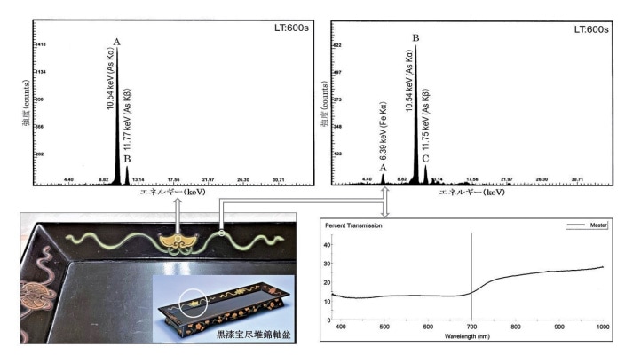 絵画的文様を漆器に施す技法として「堆錦」がある。これは、漆に顔料を均等に練り込んだ「堆錦餅」を薄く延ばして文様の形に切り抜き張り付ける技法で、図22に示した国宝「黒漆宝尽堆錦軸盆」もその一つとなる。この図に「黄色」の堆錦部分から得られた XRFスペクトル(左上)と「緑」の堆錦部分から得られた XRFスペクトル(右上)、そして同じ「緑」の堆錦部分から得られた可視-近赤外 Rfスペクトル(右下)を示した。まず、「黄色」の堆錦部分から得られた XRFスペクトル(左上)では、スペクトルAと B が検出されており、最も強度が強いピークA のエネルギーは10.54 keV を示し、これに対し1桁程度(10:1程度)の強度を示しているピークB のエネルギーは11.77 keV を示している。この強度比は、ピークA がKα線でピークB が Kβ線であることを示し、表2から検索すれば、ピークAと B はヒ素(As)から発生した Kα線(10.532 keV)と Kβ線(11.726 keV)に相当する。したがって、ここには黄色の「石黄(As2S3)」が使われたことが判る。すなわち、この黄色の絵画的文様には、漆に「石黄」を均等に練り込んだ堆錦餅が使われている。次に、緑の堆錦部分から得られた XRFスペクトル(右上)においては、最も強度が強いピークBと、これに対して1桁程度(10:1程度)の強度を示しているピークC は、前者が Kα線を、後者が Kβ線を示しており、ピークBとピークC が示しているエネルギーは、表2から黄色い顔料「石黄」の Kα線と Kβ線に相当する。また、この XRFスペクトルには6.39 keV を示すピークA も検出されているが、これは地塗りに使われた黒漆、すなわち鉄粉あるいは鉄の塊を漆液に入れて製した黒漆16)に由来する鉄(Fe)の Kα線(6.400 keV)であって、この黄色の堆錦部分に由来する Fe の Kα線ではない。このことは、地色の黒の部分から得られた XRFスペクトルに Fe の Kα線と Kβ線の両スペクトルが強く現れていたことからも理解できる。それでは、「緑」とするために黄色の「石黄」と共に使われた「青の色材」は何か?を探らなければならない。緑漆には「緑青」が使われた例があると言われている16)。しかし、ここでは「緑青(CuCO3・Cu(OH)2)」に由来する銅(Cu)の Kα線(8.041 keV)も、その Kβ線(8.905 keV)も検出されていない。また、「古い時代の史料を見ると藍染に使用する藍を使用しているとある」16)。しかし、「青代(藍)は当時あったが石黄と混ぜて使ったかは不明である」17)とされてきた。そこで、分析方法を変えて、同じ緑の堆錦部分から可視-近赤外 Rfスペクトルを測定した。それが、図22の右下に示した可視-近赤外 Rfスペクトルである。この可視-近赤外 Rfスペクトルには、測定箇所の色相が「緑」であることから、それが反映して青の色覚を生じさせる400 ~ 500 nm の領域にピークは現れていない。しかし、前記した図11の C に示した「藍」のスペクトル形状と同様に近赤外線領域の700 nm からスペクトルが立ち上がり近赤外線を反射している。藍染の「藍(インジゴ)」は、藍甕の中では水溶性のロイコ塩(緑色)を呈し、これが空気中で酸化されて青く結晶化し不溶性となるため顔料に用いられる18)。これらのことから、この緑の堆錦は、黄色の「石黄」と青の「藍」を練り込んで混色した「緑」と判定した。