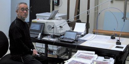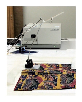 私達が最初に使用開始した装置は日立 F-4010形分光蛍光光度計であった。共役二重結合が発達した分子構造をもつ植物や動物由来の天然染料23)であれば、固有の励起波長と蛍光波長を有し、三次元蛍光スペクトルによって得られる等高線図(蛍光指紋)から、その染織物に染着している染料が直接同定できると考え、1990年代の初頭から研究を開始した24)。その後、装置を F-4500形に切り替え、さらに光ファイバーを導入して研究の対象を染織物から浮世絵版画へと展開し25,26)、同時にオンサイト分析では F-2500形を採用して日本国内の美術館やボストン美術館(USA)で浮世絵版画の非破壊分析を進めた27)。現在は、F-7000形を使用して漆器に使われた漆の非破壊分析へと研究を進めている。1990年代から現在に至るまで使用してきた分光蛍光光度計の能力は、都度向上しており、特に測定時間の大幅な短縮(スキャンスピードの高速化)、光源とするキセノンランプの大幅な寿命延長、そしてデータ解析機能の充実があった。また、オンサイト分析で使用している F-2500形の後継機としては、小型蛍光光度計の F-2700形(41 kg)が考えられる。