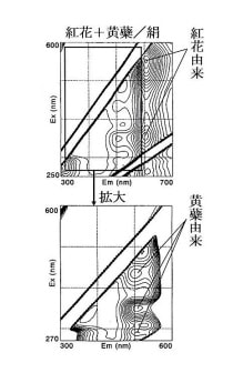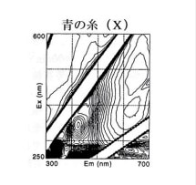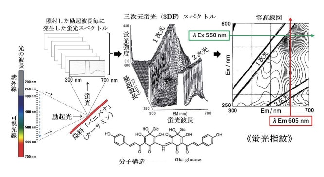 図26 染料「紅花(カーサミン)」の3DFスペクトルと等高線図《蛍光指紋》