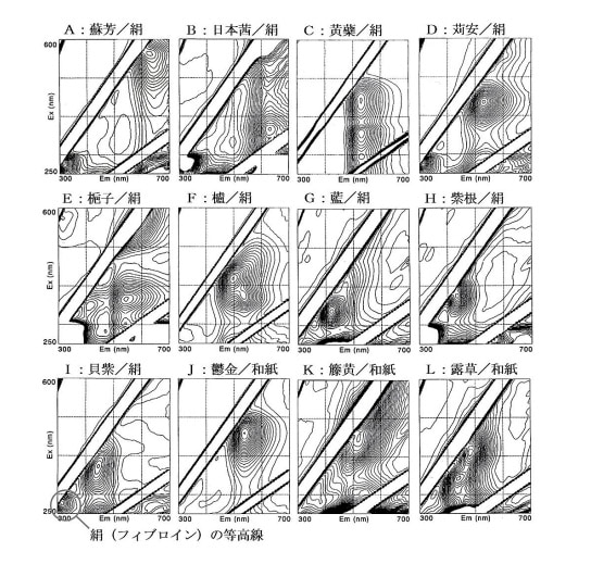 染料「紅花(色素:カーサミン)」から得られる3DFスペクトルと等高線図(蛍光指紋)を図26に示した。3DFスペクトル測定では、異なる波長の励起光を順次試料に照射し、その都度試料から発生する蛍光スペクトルを測定していく。照射する励起光の波長領域(通常は250 ~ 600 nm)と異なる波長に移動していく間隔(通常は5 nm)、そして異なる励起光毎に発生する蛍光スペクトルの測定領域(通常は300 ~ 700 nm)を設定して測定を開始する。照射した励起波長毎に測定される蛍光スペクトルは少しずつ変化していく。照射する励起光の波長を250 nm から開始し、5 nm の間隔で励起波長を移動し(変えて)、600 nm で終了したとすれば、蛍光スペクトルは合計71回測定される(図26の左)。そして、照射した励起波長毎に測定された蛍光スペクトルを励起波長(Ex)と蛍光波長(Em)と蛍光強度の三次元で表示する(図26の中央)。これを「三次元蛍光(3DF)スペクトル」28)と呼んでいる。そして、この鳥瞰図のように見える山並みの姿を地形図で土地の高低を平面図上に表すように等高線に書き換える(図26の右)。これが試料から発生した固有の「蛍光指紋」であり、これをもって繊維を染めた染料や浮世絵版画などの色材として使われた染料を識別し同定する。図26の右に示した等高線図は、この図の中央下に示した分子構造をもつ染料「紅花」の色素「カーサミン」から得られた「蛍光指紋」であり、この「蛍光指紋」は染料の分子構造に由来し、染料が異なれば、すなわち染料固有の分子構造が異なれば異なる指紋となる。科学捜査では、ヒトの指紋から人物を特定する。現場に残された指紋(遺留指紋)と警察庁の指紋センターが管理する800万件以上の犯罪者指紋および数10万件以上の犯行現場に残された過去の遺留指紋を自動指紋識別システム(Automated Fingerprint Identification System:FAIS)で照合し、検索された指紋が遺留指紋と一致するか否か鑑識の専門家が最終的に判断する29,30)。文化財に使われた染料を蛍光指紋から判定する場合は、文化財から得られた遺留指紋にあたる蛍光指紋と実験準備した標準試料から得られる蛍光指紋を照合し、一致した蛍光指紋をもつ標準試料の染料が文化財に使われた染料と同一のものとなる。この基準となる標準試料の蛍光指紋は、代表的な天然染料を使用した絹染織物や和紙に摺った天然色素から測定した。図27に単一染の絹染織物や単一の染料を摺った和紙から得られた蛍光指紋を示した。また、日本古代の染色物では2つの染料を重ねて「緋色」や「緑」を染め出している31)。赤色染料の「紅花」に黄色染料の「黄蘗(ベルベリン)」を重ねて染めた「緋色」の絹染織物を標準試料とし、これから得られた蛍光指紋を図28に、青の染料「藍(インジゴ)」に黄色の染料「黄蘗」を重ねて染めた「緑」の絹染織物を標準試料とし、これから得られた蛍光指紋を図29にそれぞれ示した。なお、図28と29に「拡大」して示している蛍光指紋は、蛍光強度が弱いために隠れている等高線のピークが識別できるように、3DFスペクトルの強度を低くして表示させている。これらの蛍光指紋を比較すれば明らかなように、それぞれの蛍光指紋は染料に固有の形状を示し、それぞれ固有の最大励起波長(λ Ex)と最大蛍光波長(λ Em)を示す等高線ピークが現れている。また、2つの染料を重ねて染めた「緋色」や「緑」の蛍光指紋では、使用した染料に由来する個々の等高線ピークが現れている。なお、これらの蛍光指紋は、共同研究者の染色家 下山裕子氏から提供された絹染織物から得られ、また故 勝原伸也氏(作家名:立原位貫氏)から提供された和紙に染料を摺った浮世絵版画の標準試料からそれぞれ得られたもので、いずれも染料既知の蛍光指紋として識別同定の基準とした。なお、これらの蛍光指紋(等高線のパターン)は、染着している物が絹や麻などの繊維であっても、あるいは和紙であっても変化しない。