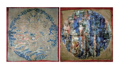図30 錦織「白茶地龍雲紋錦(16~17世紀)」と裏側(右)の測定点