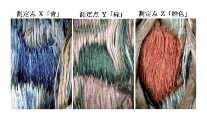 これらのことから、この「錦」に織り込まれている青の色糸は藍の単一染によるもの、緑の糸は藍と黄蘗による重ね染によるもの、そして緋色の糸は紅花と黄蘗による重ね染によるものと同定した32-34)。