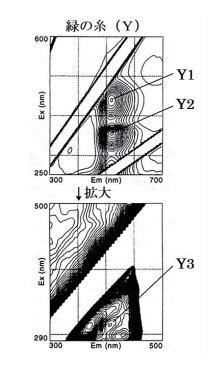 次に、「雲の文様」を織り出している緑の糸(Y)からは図33に示した蛍光指紋が得られた。この蛍光指紋は、図29に示した藍に黄蘗を重ねて染めた絹染織物から得られる蛍光指紋と一致し、Y1と Y2は染料の黄蘗に由来する等高線ピーク、Y3は染料の藍に由来する等高線ピークであることが判る。