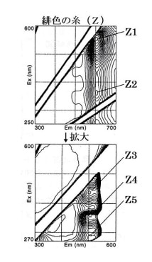 そして次に、「炎の文様」を織り出している緋色の糸(Z)から得られた蛍光指紋を図34に示した。この蛍光指紋と等高線のピークは図28に示した紅花に黄蘗を重ねて染めた絹染織物のそれと一致し、Z1と Z2の2つの等高線ピークは染料の紅花に由来し、Z3と Z4と Z5の3つの等高線ピークは染料の黄蘗に由来する等高線ピークである。
