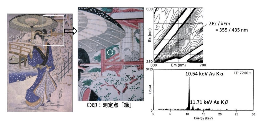 浮世絵版画では、染料の藍(インジゴ)と顔料の石黄(As2O3)による混色「緑」が3DFスペクトルと XRFスペクトルによる分析によって確認されている35)。この浮世絵は五渡亭国貞の三枚続き「江戸八景 木母寺暮雪」の右側の一枚で1821年頃(江戸後期 文政4年頃)に刊行された。この浮世絵版画の緑の測定点から得られた蛍光指紋と XRFスペクトルを図35に示した。