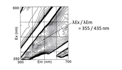 まず、この「緑」から得られた蛍光指紋は、図27の G に示した藍の蛍光指紋と近似している。しかし、等高線のピークが示す最大励起波長(λEx)は、藍のそれと比べて少し長波長側にシフトしている。また、同じ緑からヒ素(As)元素が検出され、ここには黄色の顔料である石黄が使われていることが判る。そこで、青色の藍と黄色の石黄を混ぜて和紙に摺った標準試料を調製し、3DFスペクトルと XRFスペクトルを測定した。この標準試料の XRFスペクトルから当然にヒ素(As)元素が検出され、また図36に示した蛍光指紋が得られた。この蛍光指紋は、図35に示した「江戸八景 木母寺暮雪」の緑から得られた蛍光指紋と一致し、両者の等高線ピークの位置(λEx /λEm)も一致した。この実証実験から、この浮世絵版画に限らず当時の緑は、藍と石黄の混色による発色であることも判った。なお、この藍と石黄が混在した緑の蛍光指紋が示すように、共存する顔料の影響を受けて染料由来の蛍光指紋が歪み、また蛍光性分子の蛍光強度が鉄、ニッケル、クロム、銅及びコバルトイオンなどの常磁性イオンによって著しく減少(消光作用)することがあるので注意を要する22,36)。