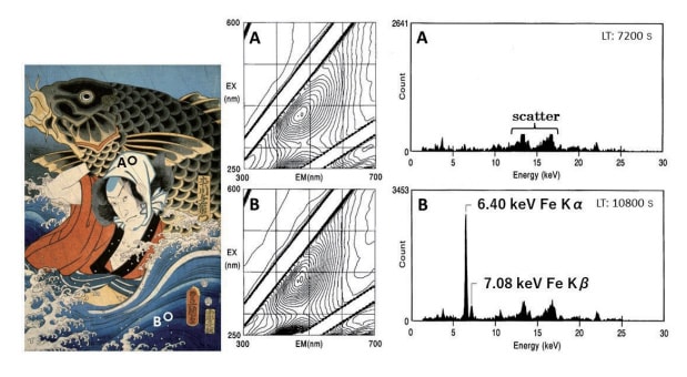 浮世絵版画は、まず彫師が絵師の版下絵に従って絵の構図(輪郭線)や絵師の名前などの文字を彫って主版(おもはん)を制作し、その主版で摺った校合摺(きょうごうずり)に絵師が構図の各所に色指定する。そして、再び彫師は、絵師に指定された色毎に版木を彫り複数の色版を準備する。次に、それらの複数の版木が摺師に渡され、摺師はまず和紙に主版を摺り、それに複数の色版を使って色摺りを重ねていく。したがって、和紙の上層に色材が摺られていくことになる。このような場合、染料が和紙の上に摺られていれば、その染料由来の3DFスペクトルが測定されるが、そこに顔料が摺られていると下地の和紙(セルロース)自身から発生する蛍光を指紋情報として捉えることになる。図37に五渡亭国貞 改め三世 歌川豊国の「浮世八景ノ内 木下川乃夜の雨」から得られた蛍光指紋と XRFスペクトルを示した。この浮世絵版画は、葛飾北斎がベロ藍を使用して浮世絵版画の世界に初めて風景画ジャンルを確立してから後の1855年(安政2年)に刊行されており、ベロ藍の使用が一般化した時代にあたる。図37の上段に色摺りされていない測定点 A から得られた蛍光指紋と XRFスペクトルを、下段には青に摺られた測定点 B から得られた蛍光指紋と XRFスペクトルを示した。この両者の蛍光指紋を比較すると、青く摺られた測定点 B の蛍光指紋は、色が摺られていない測定点 A の蛍光指紋と一致している。これは、測定点 Bの蛍光指紋が和紙(セルロース)自身の蛍光指紋であることを示しており、測定点 B の青は紫外線や可視光線では蛍光を放出しない顔料であることを示唆している。したがって、測定点 B から得られた後段の XRFスペクトルが示しているように、鉄(Fe)元素が検出されていることから、ここには青色顔料のベロ藍が摺られていることになる。このことは、彩色された部分から蛍光指紋が得られたことをもって即座に染料と判断せず、バックグラウンド(余白や色材が摺られていない箇所)から得られる蛍光指紋と比較し、もし一致していれば、そこには顔料が摺られていると推定し XRF 分析を行う必要が生じてくる。