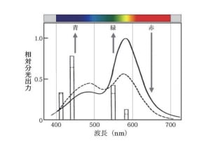 図38 蛍光灯から放出される色光(-実線は昼光色蛍光灯/ ---点線は白色蛍光灯)