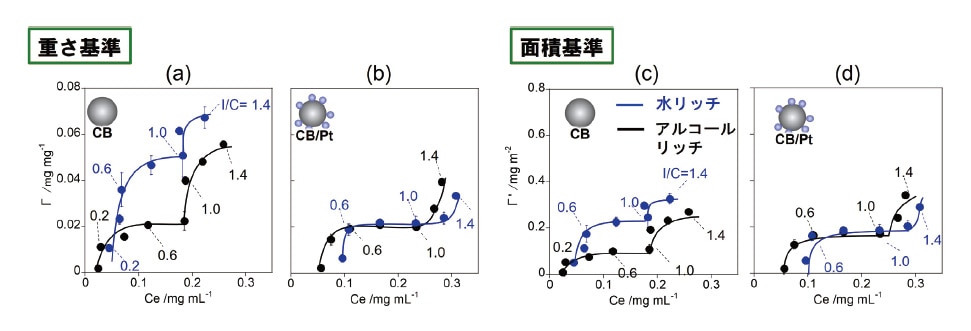 図1 (a, c)CBに対するナフィオンの吸着等温曲線および(b, d)CB/Ptに対するナフィオンの吸着等温曲線。(a, b)重量および(c, d)比表面積で規格化した水リッチ(青線)ならびにアルコールリッチ(黒線)の等温吸着曲線
