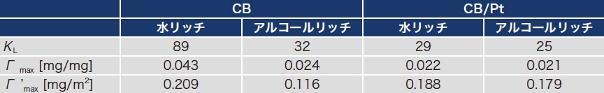 表1 CBおよびCB/Ptに対するナフィオン吸着のKL、Γmax、およびΓ'max